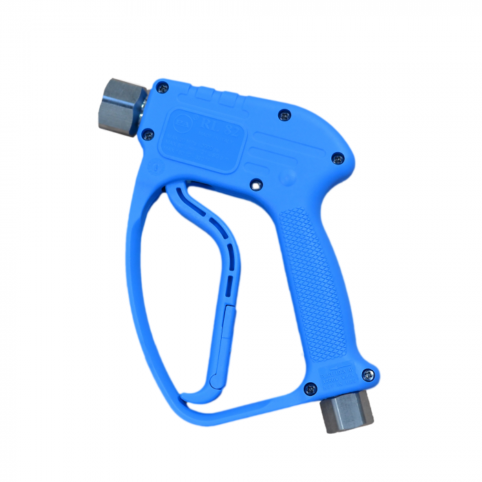 Pistolet de lavage bleu avec arceau de sécurité, apte au contact alimentaire. Filetage femelle 1/2″ en entrée et en sortie. Supporte une pression jusqu’à 200 bar et une température maximale de 160°C. Débit d’eau de 80 l/min.